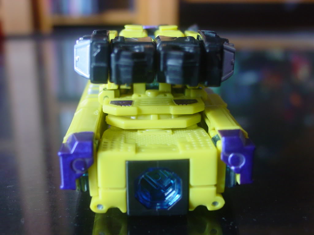 Blight is clearly modelled on G1 Swindle's colourscheme... though he's a much more acidic yellow than his predecessor, and his purple is far darker and more metallic. I cannot imagine in what situation a tank like this might be deployed, but it would certainly be effective against an enemy afflicted with a collective migraine - the colour alone would have them surrendering, running for the hills, or just killing themselves.