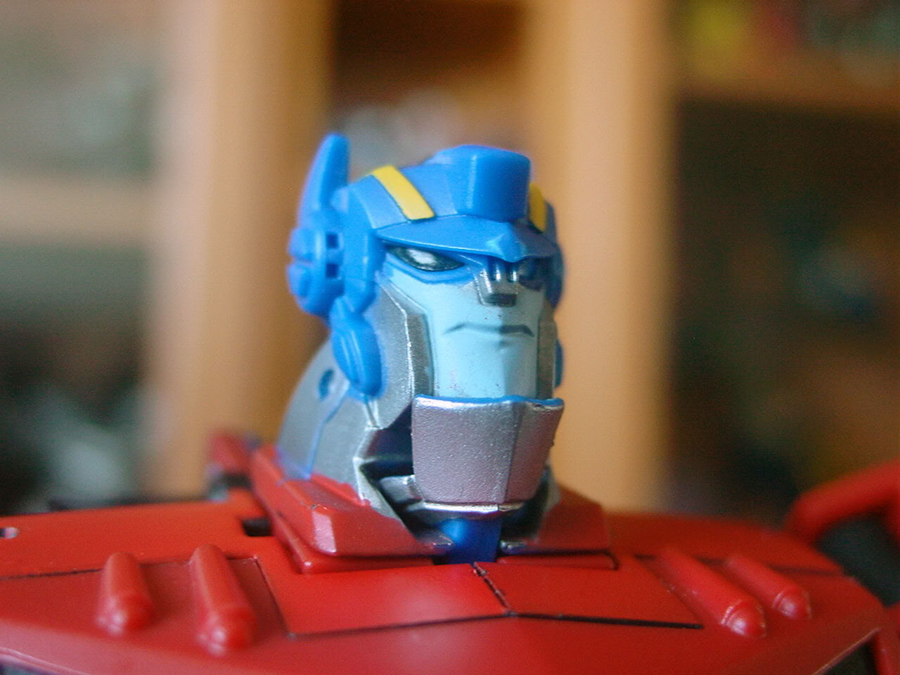 Optimus Prime's head sculpt uses the old trick of a lever on the back of the head to activate a battle mask gimmick. Trouble is, with the battle mask off, his already generous chin gains a large silver chunk on the bottom, so it almost looks as if he's wearing a neck brace. It can also get in the way of his neck's rotation as the blue chin protrusion falls into a slot in the top of the chest. The pastel blue painting of the face is fairly sloppy and doesn't quite extend up to the eyes - for a perfect match to the animation model, his eyes should be thickly rimmed with black rather than blue - nor does the silver on his cheek plates and neck cover fully around the stylised 'sideburn' parts of the helmet. The small armour plate that passes for a nose on this thing isn't fully painted either, with a small blue border where the silver paint doesn't reach the brim of his helmet. On the upside, the light piping is very effective, and has that 'pupil' effect that turned up on most TF Animated figures.